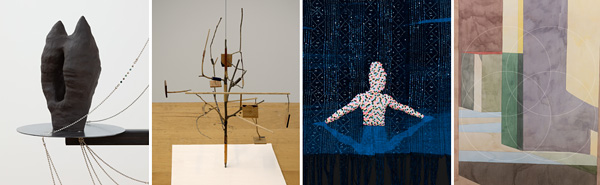 Images (left to right): Shanie Tomassini, Apparition (detail), 2024, black stoneware, welded steel, laser cut steel, ball chain, pyrite, smoky quartz, tiger eye, jade, jasper, hematite; David Merritt, altr arber (detail), 2019, stacking table, twigs and mixed wood products, picture hanging wire; Émile Régnier, EM (detail), 2024, screen printing on Malian Indigo, with sequins and glass beads; Ella Gonzales, A kind of proposition (detail), 2023, acrylic on jusi silk, metal hinges