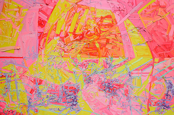 2. A large horizontal abstract painting in bright pink and yellow with touches of purple and blue.