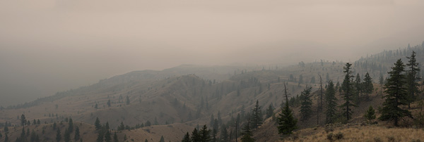 Major bodies of works in Hayeur’s studio practice are focused on environmental changes caused by human development or natural causes. Her photographs document the destruction of natural habitats and whole ecosystems. The exhibition titled Wild Times presented at the Vernon Public Art Gallery consist of photographs of landscapes affected by forest fires in Quebec and British Columbia in the 2020 and 2021 summer seasons. The photographs from sites near Las Saint-Jean depict the after effects of the wildfire which changed the ecosystems in the largest forest fire in the province’s history. The images captured in 2021 show the active fires in British Columbia. The oppressive plumes of raising smoke changed the appearance of the landscape and the thick smoke was hardly penetrated by the sun’s rays. The toxic smoke drifted through large areas and the images captured from satellite views exemplified the apocalyptic scale of the burning infernos.