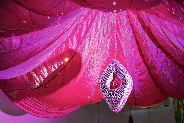 1. A labia-shaped mirror ball is suspended from the ceiling by thick steel chain. It is tented by rich pink parachute fabric creating an image suggestive of a circus tent or blossoming flower.