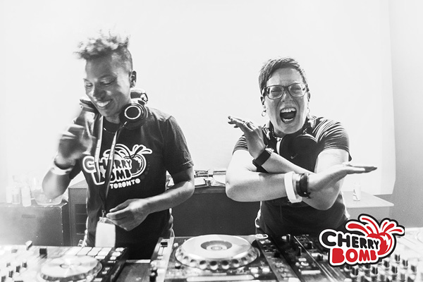 2. Black and white photograph of two queer women side by side behind a large DJ console. DJ on the left smiles widely with eyes closed and wears a Cherry Bomb Toronto t-shirt. DJ on the right has arms crossed, mouth wide open. Both are in their element and in the groove.