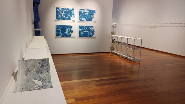 3) A gallery with 4 large cyanotypes on one wall, shelving units filled with white objects as if they were in a museum, a handmade accordion book work on a long wall shelf, and hand-painted text on the far wall.