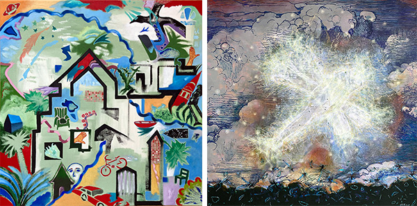 Joseph Muscat, Shelter Skelter, 2024, Acrylic on canvas, 26 x 26 in. | David Griffin, One of Many Circles, 2025, Mix media, 39 x 39 in.