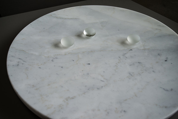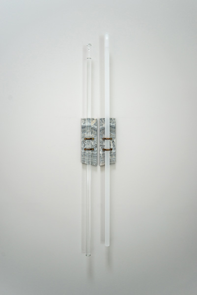 Karen Miranda Abel, installation detail of the exhibition Once A Sea (where stone turns water into clouds), carved Carrara marble (salvaged), flameworked glass, 2026. Image courtesy of the artist.