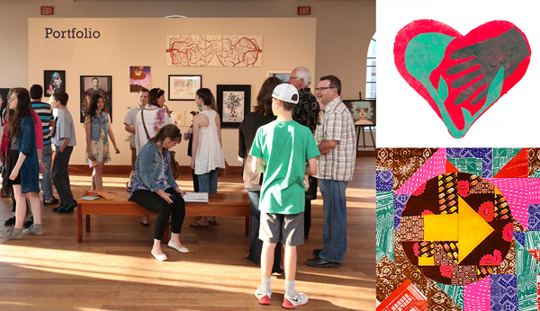 Images (clockwise from left): Guests gather in the Carnegie Room for Portfolio. Photo: Andre Beneteau; Print artwork from CommUNITY; Artwork by Katie Green for Translations in Vision. Image courtesy of the artist.