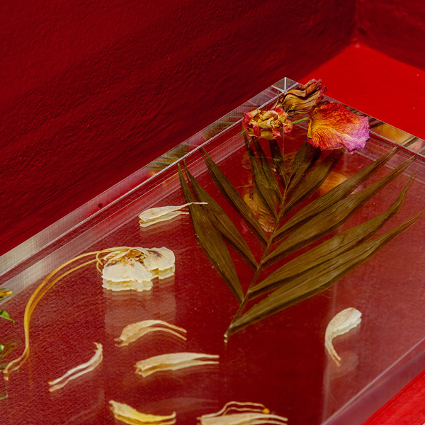 2. A close-up photograph from one of the Vitrines with a mirror and plexiglass with dried florals set on top.