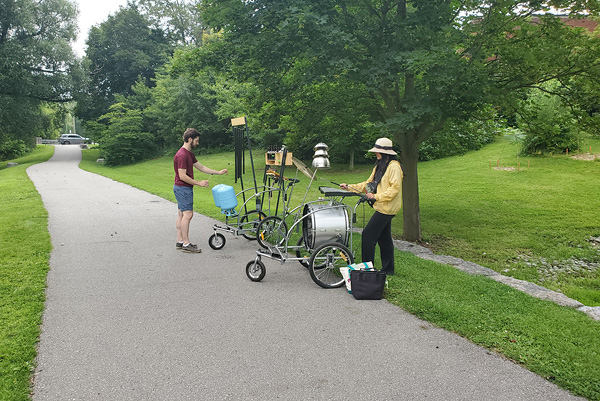Two local musicians playing Lost and Found musical carts on the Rouge River Trail in the summer of 2023. Photo by Alessandra Pozzuoli.