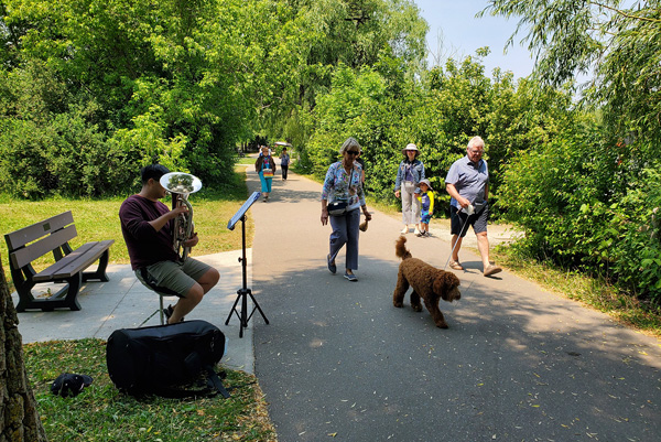 Local musician playing the euphonium on the Rouge River Trail in the summer of 2023 as part of Lost and Found. Photo by Alessandra Pozzuoli.