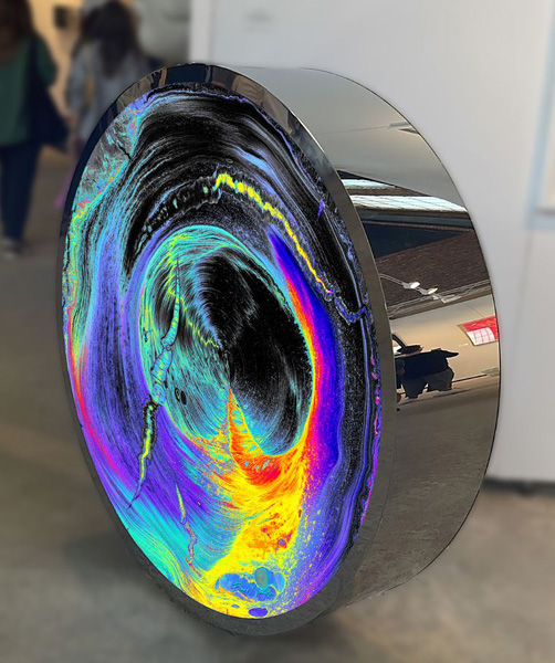Emre Namyeter, High Frequency, Mixed media on tempered glass, titanium finished stainless steel and LED, 2025. Photo courtesy of the artist.