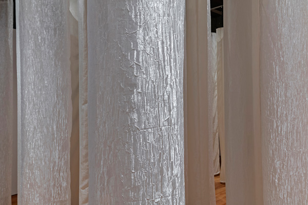 the Forest for the Trees envelopes the gallery, offering an immersive experience that aims to bring something of the forest to the city. An installation of fabric trees, all suspended from above, with diffuse light filtering through, and the occasional haunting sound of nature enhances the feeling you might be somewhere other than a building downtown. As you walk through the trees you cannot help but touch them, moving them, disturbing them. After you pass by, the disruption fades and the trees return to their natural state of being. The work is a subtle comment on how the environment restores itself after humankind has gone. Several large scale paintings accompany the installation.