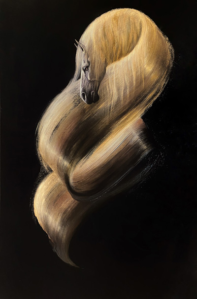Mahmoud Azadnia was born in an artistic family in Iran in 1986. He started learning drawing and painting with his father when he was a little child. In 2010, Mahmoud began pursuing a professional career in the arts. Since then, he has participated in more than 20 group and solo exhibits in Iran and abroad, including in France, Germany, Spain, Belgium, and Italy. By incorporating religious themes and in other collections with cartoon figures, he was able to win over audiences and art critics early on in his painting career. Then he could draw in art collectors and lovers with a distinctive collection he made from interlaced waves, horses, and occasionally thick forests. When confronted with a mythological atmosphere in this collection of works, the viewer appears to delve into an ancient tale’s depths until eventually freed with a sense of unknowable serenity. Sometimes the spectator experiences a contradiction between exhilaration and a leisurely pace of life as a result of the collection’s usage of cool hues and twisted horses in front of these trees.