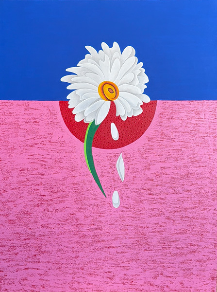 “The Daisy” series began from a desire to explore a softer kind of strength. My work often leans into emotional intensity and layered themes, and I felt ready to return to something more playful, something rooted in innocence and hope. “He Loves Me, He loves Me Not” is such a simple childhood ritual, yet it carries a quiet anticipation we all recognize. The daisy became a way to revisit that moment before love becomes complicated.