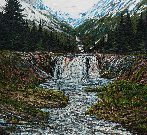 In Coming Down the Mountain, Bahen speculates on the narrative device of Chekhov’s Gun. Conceptualised by Russian storyteller Anton Chekhov, it stipulates that if a gun is written into a story then it must be fired at some point in the plot. In other words, past activities hold significant meaning for future events. Applying this notion to the ten paintings displayed in the exhibition, pictures of cascading water serve as a potent metaphor for how (in)actions, left unchecked or ignored, can fester over time into catastrophe. For Bahen, the past has a way of catching up to us.