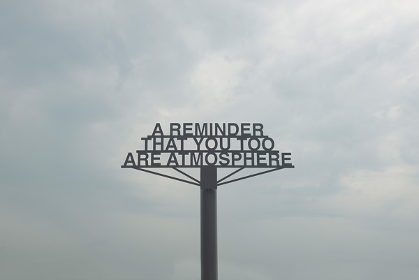 1. The image depicts a metal sign with the words “A reminder that you too are atmosphere” displayed in front of a grey and cloudy sky.