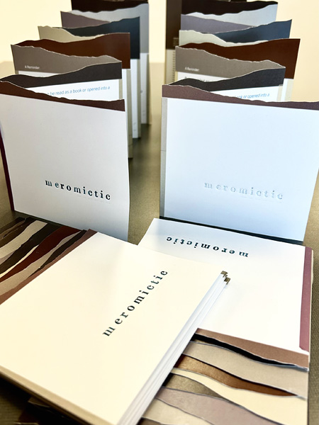 3. Two booklets with letterpress printing on the front spelling out meromictic lie in front of two similar booklets that have been unfolded in accordion style. The top of each booklet mimics stratigraphic layers.