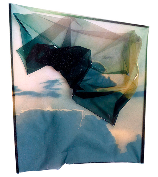 Description: Photograph of a sheer cloth juxtaposed overtop of an irregularly shaped image of clouds in a blue and pink sky.