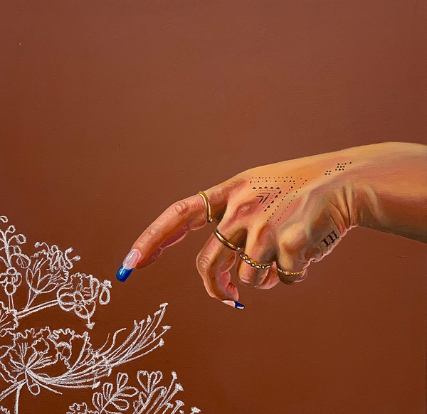 Surrounded by glints of silver and gold, rich browns, patterns, and allegory, Michelle Peraza’s solo exhibition, Repeating Granadas, visualizes the ambiguity and complexity of identity within the LatinX community. Peraza’s deliberate choice of colour, materials, imagery, and stylization in her artistic practice prioritizes contemporary LatinX bodies. Inspired by Gloria Anazaldúa’s theoretical framework of mestiza consciousness/the new mestiza, Peraza’s research-based artistic practice critically examines the Western Art History canon and deconstructs the Spanish colonial project of ‘Latin America.’ Through her high-realism portraits, site-specific installations, and non-representation drawings, Peraza engages with themes of transculturation, postcolonialism, feminism, identity, extraction and relocation, image dissemination, gender politics, materiality, representation, and resilience.