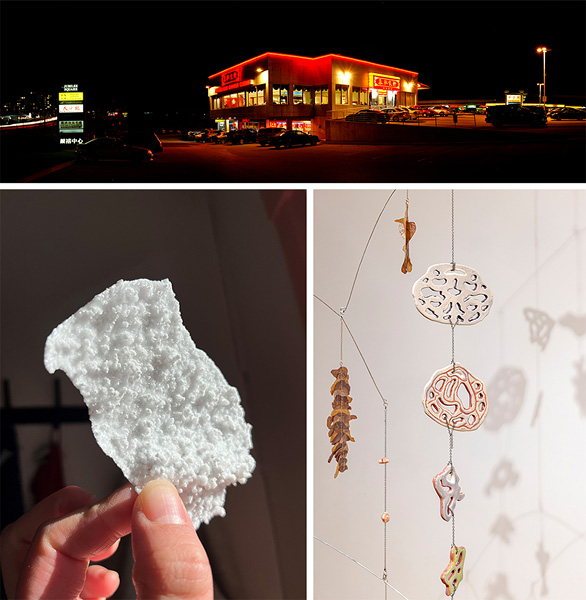Image (top): Morris Lum, Ambassador Chinese Cuisine on Highway 7 and West Beaver Creek Rd, Markham, 2009, photography, 6’ x 2.5’. Images (bottom left to right): Stephanie Yee, Untitled, 2024, Crystalized MSG. Joy Wong, detail of Lineages, 2023, glazed earthenware, kombucha SCOBY, wire and metal, 30” x 36” x 90”. All images courtesy of the artists.