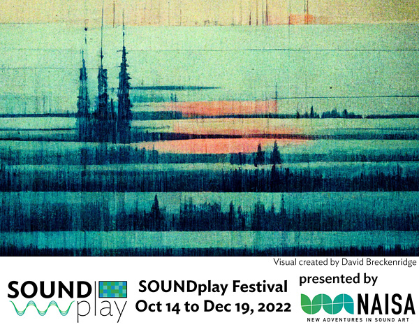 “This year’s SOUNDplay Festival provides audiences with access to digital immersions into the sonic and visual textures of natural environments. The approach is multi-disciplinary as always with SOUNDplay — the artists presented use written diaries, poems, photography, video, sound recording, and electroacoustic composition in their highly personal, and sometimes political, responses to human interactions with the natural world.” — Darren Copeland, Artistic Director, New Adventures in Sound Art