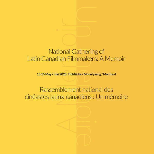 National Gathering of Latin Canadian Filmmakers: A Memoir has been developed as a post-event community resource to spark ideas about what Latin Canadian cinema is today and what it can be in the future, and features essays by Cecilia Araneda (Winnipeg), soJin Chun (Toronto), felippe (Quebec City), Darien S. Nicolás (Montreal), Milena Salazar (Vancouver) and Zaira Zarza (Montreal), that serve as reflections on the event. The publication includes French translations.