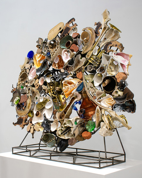 In the form of three-dimensional collages, the sculptures become a convergence of time and matter, where each fragment retains traces of its origin while being transformed by its association with other elements. Materiality is not seen here as a simple support, but as an active force, capable of producing meaning, resisting fixity and suggesting new readings of our current era. Thus, these works do not merely document the world; they offer an alternative stratigraphy, made up of juxtapositions, fractures and unexpected arrangements.