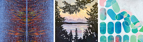 Images (left to right): Lori Ryerson, The Meadow at Midday, 2022, Photography on glossy metal; Sheila Merer, After the Storm, 2023, Acrylic; Jen Tse, Tumbling, 2023, Acrylic