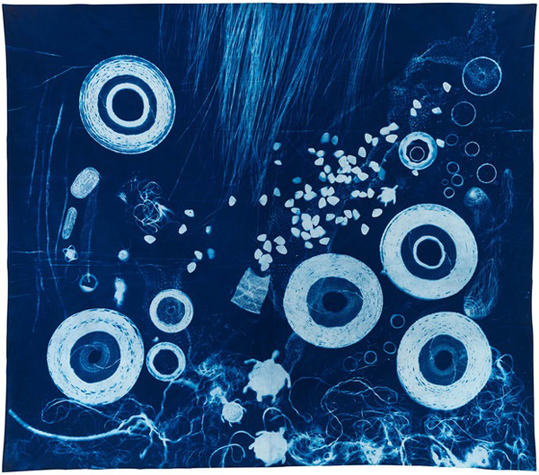 Wagari: Dabiyil, Biram – Vessel: water and sky is a collaborative large-scale cyanotype textile featuring imagery of handwoven forms and string and found objects. On view until October 5, 2022 at 19 Colonel Samuel Smith Park Dr. Etobicoke exhibition sponsor Humber College supported.