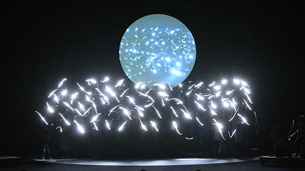 1. A group of people in darkness, wave small lights that create glowing trails. Above them is a large blue circular screen with specks of light, resembling a moon.