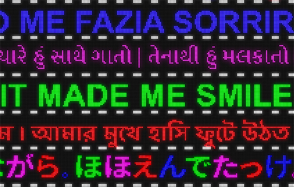 2. Words in multiple languages in rainbow colour are stacked on top of one another in a karaoke style. The words read “When I was young I’d listen to the radio.”