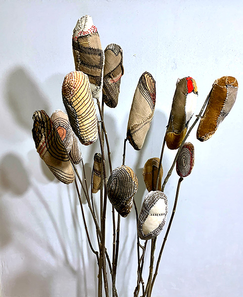 Judith. E. Martin, Thoughts and Memories and Dreams (detail). Fourteen bundles; wool, velvet, dried butterbur leaves, alpaca roving, silk and wool threads, foraged branches; wrapped, hand stitched mounted on a 16” square wooden base (40.6 cm), the tallest is 83” (210 cm). Image credit: Document original