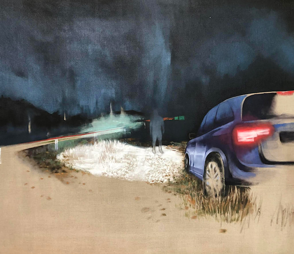 Pierre St-Jacques, Untitled (Night Road), Oil on Linen, 56″ x 48″ (142 cm x 122 cm), 2025