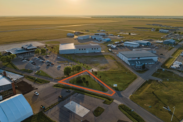 1. Aerial view of Lethbridge’s airport with the site for public art delineated in orange.