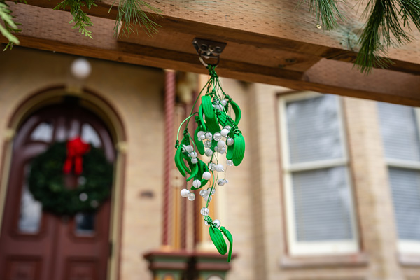 1. Red and green mistletoe hanging in a doorway near a lamp.