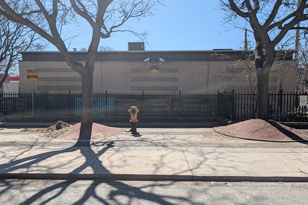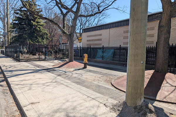 1 + 2. Images of the installation site, looking directly at it and from a side profile, in Toronto’s Cabbagetown BIA on the public right of way adjacent to the sidewalk at Amelia Street and Parliament Street. Demonstrates size and existing trees.