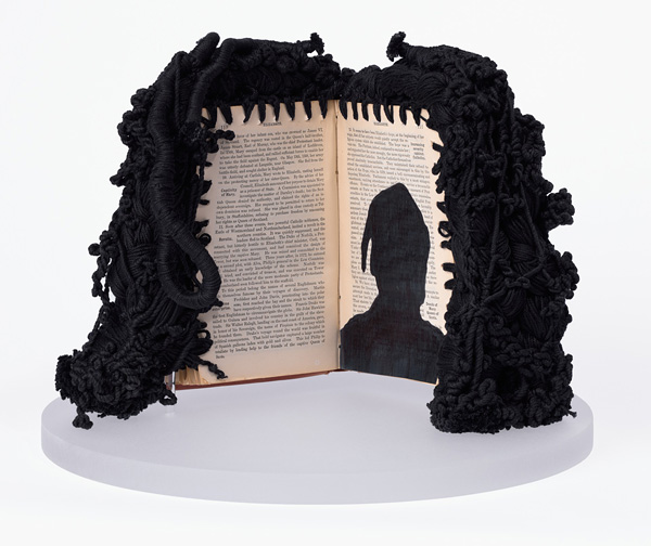 1) An open book with the silhouette of a bust shown against an inside page and swirls of black cotton stitched into the page.