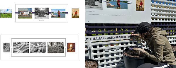 (Top Left) Jeff Thomas, Corn = Life, 2021, 30” x 92”, pigment print on aluminum. Courtesy of the artist. (Bottom Left) Jeff Thomas, Broken Treaties, 2021, 30” x 92”, pigment print on aluminum. Courtesy of the artist. (Right) Ron Benner, Jeff Thomas, Corn = Life: The Power of Naming, 2024, photographic/garden installation view, Steelcase Art Projects, Markham, ON. Photo credit Yuluo Wei.