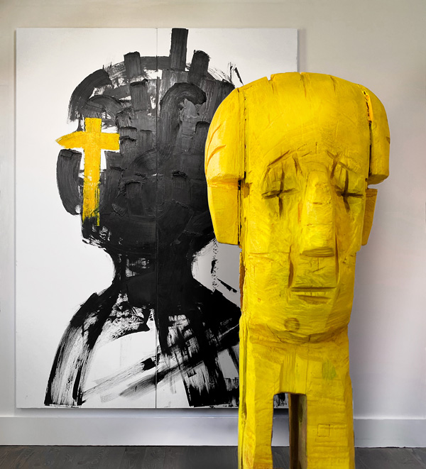 A photograph shows a wooden sculpture of a head, painted vibrant yellow. In the background, a gestural painting of a head, in black, is enlivened by crossed yellow lines in lieu of an eye.