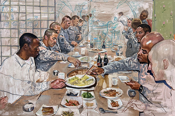 1) Sadko Hadžihasanović, Last Supper (detail), 2020, oil on pastel on Masonite. Photo courtesy of the artist. Description: Close-up view of a unit of multicultural soldiers sitting together eating at a long banquet table.