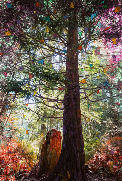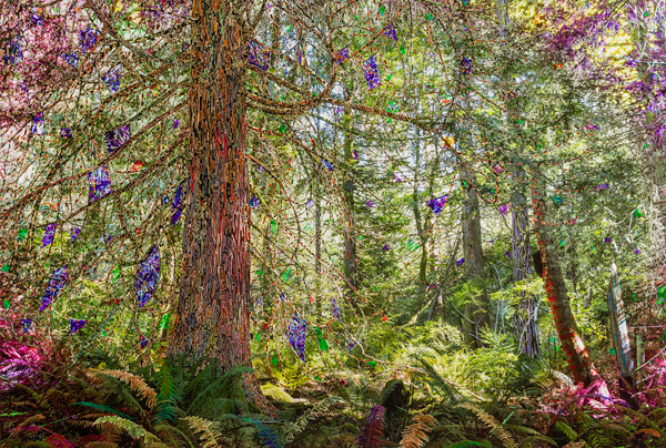 In Cedar Forest, the trees appear alive, vibrating with the colour and energy that Johnson draws out of them. Through careful application of digital chroma, iridescent tapes, gold leaf, and oil paints, she transforms the landscapes into otherworldly vistas—both familiar and fantastical. These images not only highlight the innate beauty of the natural world but also allude to its innerworkings and connectedness.