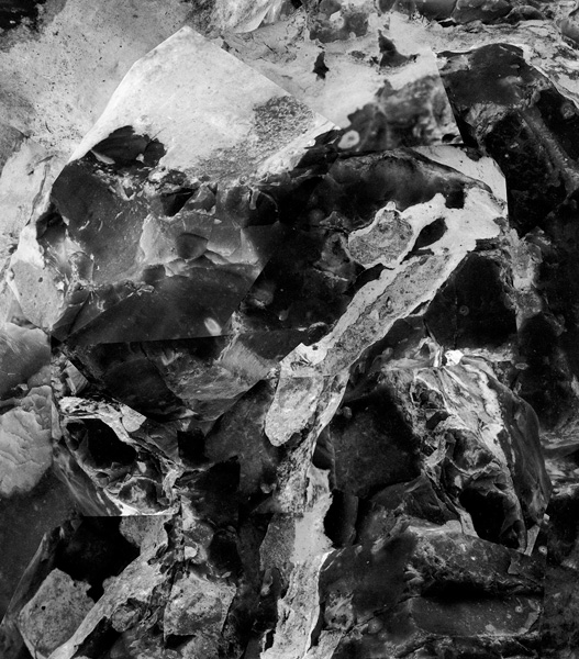 Splitting Distance features a series of photographic collages that transmit icy surfaces, tumultuous waters, rocky shores, and portals. This flint originated from the shores of France or the United Kingdom and is now found in Glace Bay, whose namesake was coined by French settlers, who named the location “Baie de Glace” (Bay of Ice). The chalky surface of the flint gives way to semi-translucent surfaces with reflective flecks and shards, similar to the textures and patterns found in ice and light bouncing off of water.