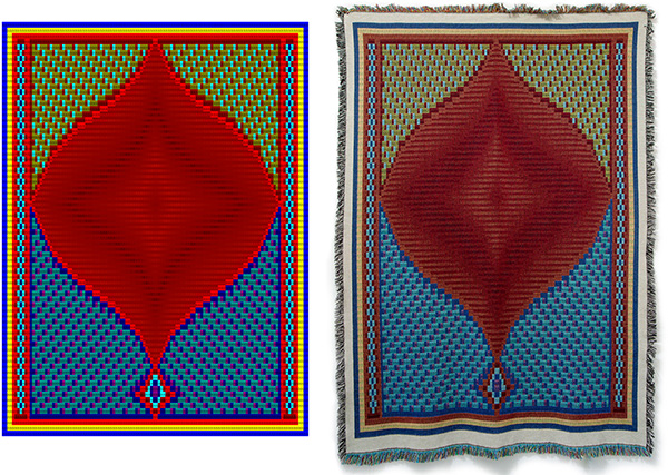 Left to right: CG1216For6080JT N1, 2021. Digital print on watercolour paper. CG1216For6080JT N1, 2022. Cotton tapestry, woven by Jacquard loom. Image courtesy of the artist and Patel Brown Gallery.