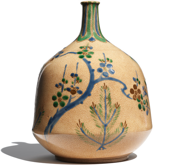 Sake Bottle, Ko-Kiyomizu ware, Edo period, late 17th to mid-18th century, glazed stoneware with overglaze enamels, 16.6 x 11.7 cm.