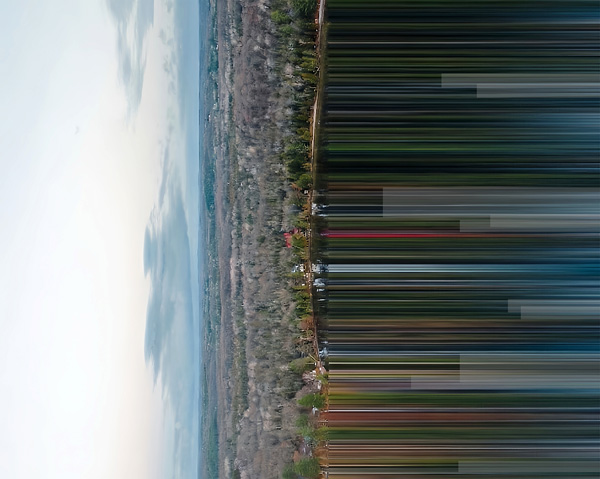1. A landscape photograph of a forested suburban area rotated ninety degrees. Superimposed onto the foreground of the landscape is a field of thin, multicoloured lines and rectangular blocks that give the impression of a corrupted image file.