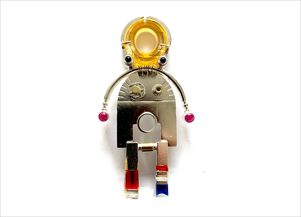 Pasha Moezzi, Edwina, 2024. Sterling silver brooch, roller printed 18K yellow gold, 18K gold tubing, murrine glass, sapphires, rubies. Image courtesy of the artist.