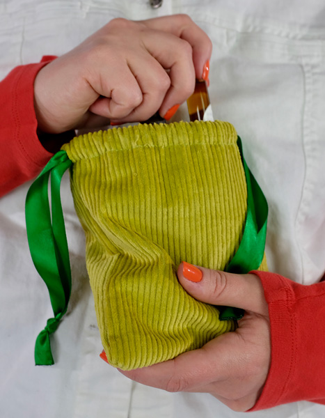 1) A person’s hands are pictured pulling an essential oil out of a green pouch that they are holding. They are wearing an orange long-sleeve shirt, a white vest, and orange nails.