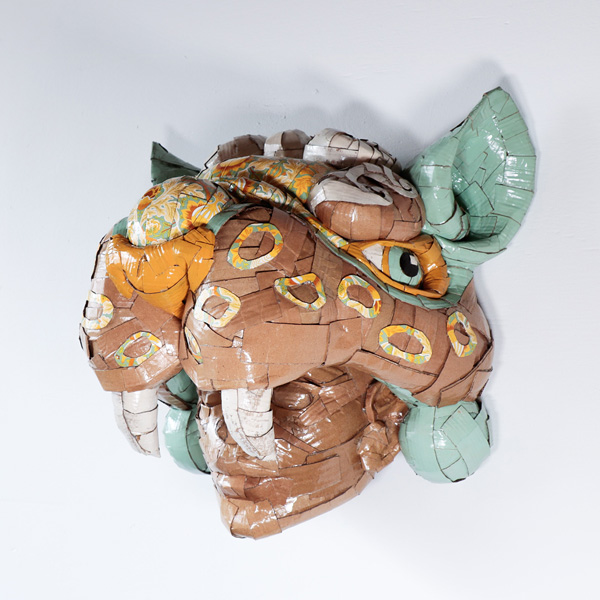 Environmental concerns and sustainability lie at the core of Vallières’s practice, which she expresses through depictions of animals and references to cartoon characters like Mickey Mouse and Tweety Bird. Reflecting on her ties with urban art, where work is often created in response to pressing cultural, social, and political issues, her dedication to cardboard serves as a call for sustainability—a commentary on consumer culture, advocating for the movement of reuse over consumption and waste.