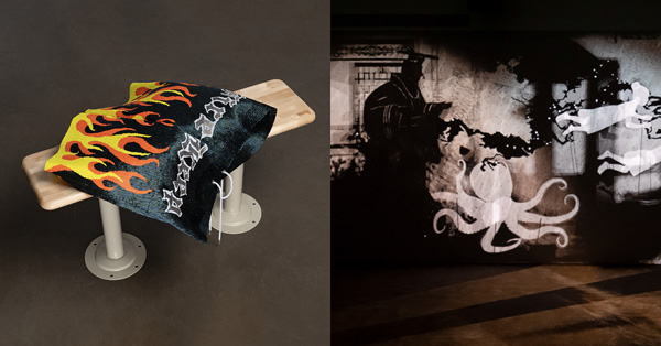 Left: Nico Williams, Flamer, 2022. 11/0 seed beads on thermally-fused/braided polyethylene thread, maple, cottonwood and metal. Courtesy of the artist and Blouin Division. Photo: Paul Litherland. Right: Lap-See Lam, Tales of the Altersea, installation view, Swiss Institute, New York, 2023. Courtesy the artist and Swiss Institute, New York. Photo: Daniel Pérez.