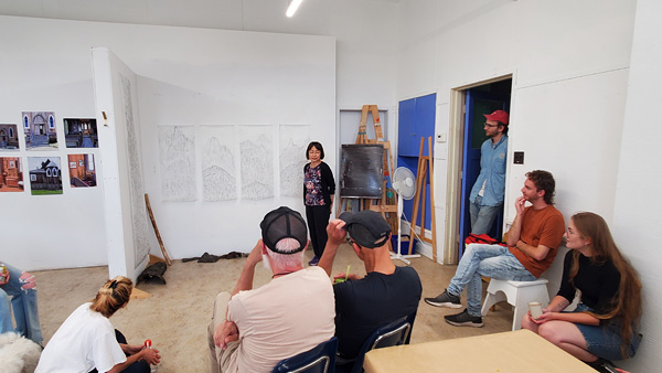 Photo by Jessica Peachey for Island Mountain Arts, 2023, featuring artist Wen Li and 2023 Mentors Ed Pien and Johannes Zits.