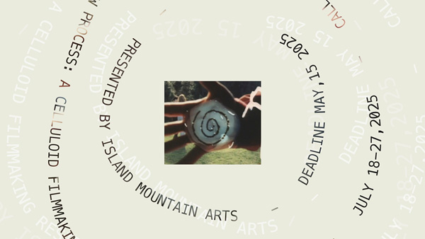 2. A light green background with a small image in the centre (submitted by Steven Woloshen) that features an outstretched hand with a spiral in it. Text spirals around the image, reading “Slow Process, A Celluloid Filmmaking Residency,” “Deadline May 15, 2025,” “Presented by Island Mountain Arts” and “July 18 – 27, 2025.”