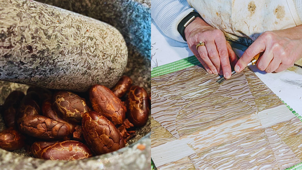 3. Two images. On the Left, a stone pestle to the left, resting on Cocoa Beans. The right, and image of Mary Anne Molcan’s hands, carving a large lino-cut.